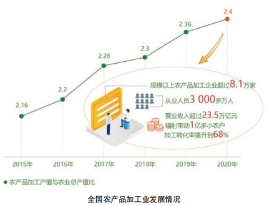 农产品加工业从种养业延伸而来,是国民经济的重要产业,是农业现代化的重要标志。“十三五”期间,我国农产品加工业总体规模保持稳定,行业发展质量效益明显提升,行业结构和布局持续优化,转型升级不断加快。2020年,农产品加工业营业收入约23.5万亿元,规模以上农产品加工企业超过8.1万家;加工转化率提升到68%,比2015年提升3个百分点;农产品加工业与农业总产值比提升到2.4∶1,比2015年提高11.1%。农产品加工业的发展,延长了农业产业链、提升了农业价值链、保障了农业供应链、完善了农业利益链,在促进农业提质增效、农民就业增收、提高人民群众生活质量和健康水平等方面发挥了重要作用。