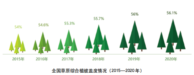 “十三五”以来,草原生态质量明显提高。2019年全国草原综合植被盖度达到56%,较2015年提高2个百分点,提前一年完成《规划》目标,2020年达到56.1%。天然草原鲜草总产量突破11亿吨,重点天然草原平均牲畜超载率降至10.1%,较2015年下降3.4个百分点。草原防风固沙、涵养水源、保持水土、固碳释氧、调节气候、美化环境、维护生物多样性等生态功能得到恢复和增强,局部地区生态环境明显改善,全国草原生态环境持续恶化势头得到有效遏制。