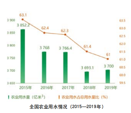 在灌溉面积扩大、灌溉保证率提高、粮食总产量稳步增加的情况下,我国农业用水总量持续下降,农业灌溉用水效率和效益逐步提高。2019年降到3700亿米3,占总用水量的比重降到61%。我国农田灌溉排水事业的发展,特别是大中型灌区改造建设为保障我国粮食安全、农民持续增收、促进现代农业发展和缓解水资源供需矛盾,实现水资源可持续利用作出了重大贡献。