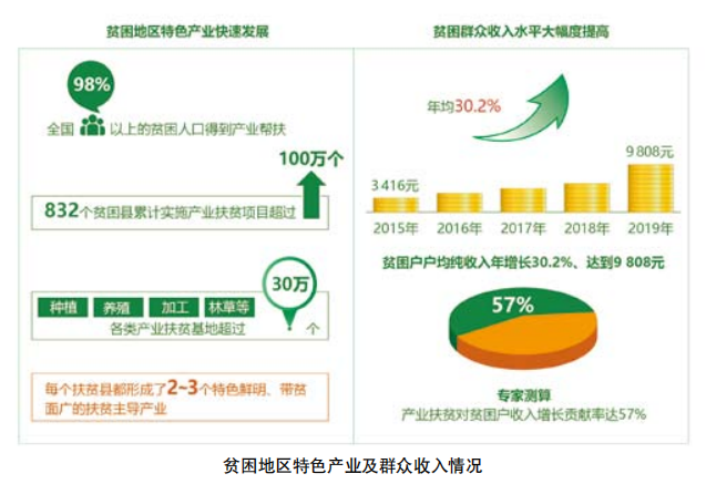 “十三五”以来,我国贫困地区特色产业加快发展、联贫机制不断完善,产业扶贫已经成为覆盖面最广、带贫人口最多、可持续性最强的扶贫举措。全国832个贫困县累计实施产业扶贫项目超过100万个,建成各类产业基地超过30万个,每个贫困县基本都形成了2~3个特色鲜明、带贫面广的扶贫主导产业。在建档立卡的贫困人口中,90%以上得到了产业扶贫和就业扶贫支持,2/3以上主要靠外出务工和产业脱贫。2015—2019年贫困户人均纯收入由3416元增加到9808元、年均增长30.2%。产业扶贫既为打赢脱贫攻坚战提供了有力支撑,也为下一步接续推进乡村振兴奠定了坚实基础。
