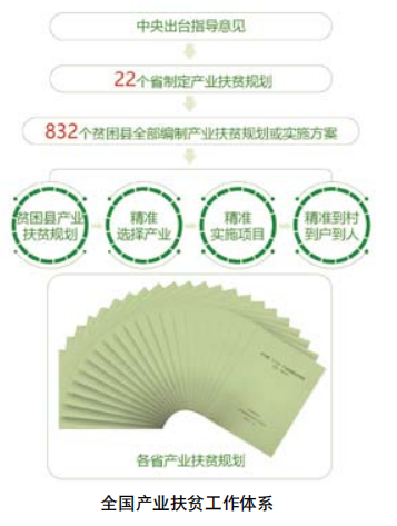2016年以来,召开3次全国产业扶贫工作会议,国务院领导同志出席会议并对产业扶贫工作作出重要部署。出台《贫困地区发展特色产业促进精准脱贫意见》《关于实施产业扶贫三年攻坚行动的意见》等文件,明确产业扶贫目标任务和到村到户帮扶举措。规划体系基本健全。中西部22个省份和832个贫困县全部编制产业扶贫规划,因地制宜确定了主导产业。四川省制定了全省、四大片区、深度贫困地区、县、村五级产业扶贫规划,形成了长江中上游柑橘、龙门山脉猕猴桃、川南优势早茶等特色产业集群发展态势。典型范例快速涌现。总结各地在特色产业发展、新型主体培育、联贫机制创新等方面的经验做法,推介了2批35个全国产业扶贫范例,发布10大产业扶贫机制创新,打造出洛川苹果、赣南脐橙、定西马铃薯等一批可学可看可推广的产业扶贫典型,有效发挥了引领示范作用。工作考核进一步完善。将产业扶贫纳入地方党委政府脱贫攻坚成效考核,重点考核政策措施落实、扶贫产业覆盖、新型经营主体带动、服务体系建设等情况,树立注重产业长期培育、提升产业发展质量的工作导向,切实克服产业扶贫领域的形式主义、官僚主义问题。