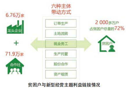 在项目安排、资金扶持、示范评定、融资贷款、保险保费、用地用电等方面加大对带贫龙头企业扶持力度,组织农业产业化龙头企业与贫困地区开展对接,将企业引进纳入东西部扶贫协作和对口支援政策框架,832个贫困县累计培育引进各类企业6.76万家、直接带动贫困人口近1200万人。农民合作社和家庭农场规范发展。农民合作社示范社评定、质量提升整县推进项目等向贫困地区倾斜,开展贫困地区农民合作社带头人和家庭农场经营者专门培训,完善家庭农场名录管理制度,引导农民合作社、家庭农场通过流转土地、技术辐射、销售服务等方式,带动贫困户融入产业发展链条。目前,贫困地区已发展农民合作社71.9万家,带动贫困户626万户、贫困人口2200万人;发展家庭农场超过15万家。贫困村集体经济加快发展。壮大集体经济试点向贫困村倾斜,总结推广陕西、甘肃、安徽、重庆等地“资源变资产、资金变股金、农民变股东”改革经验,鼓励贫困户、村集体、合作社、龙头企业组建产业发展联合体,为贫困户稳定分享产业收益提供更多保障。